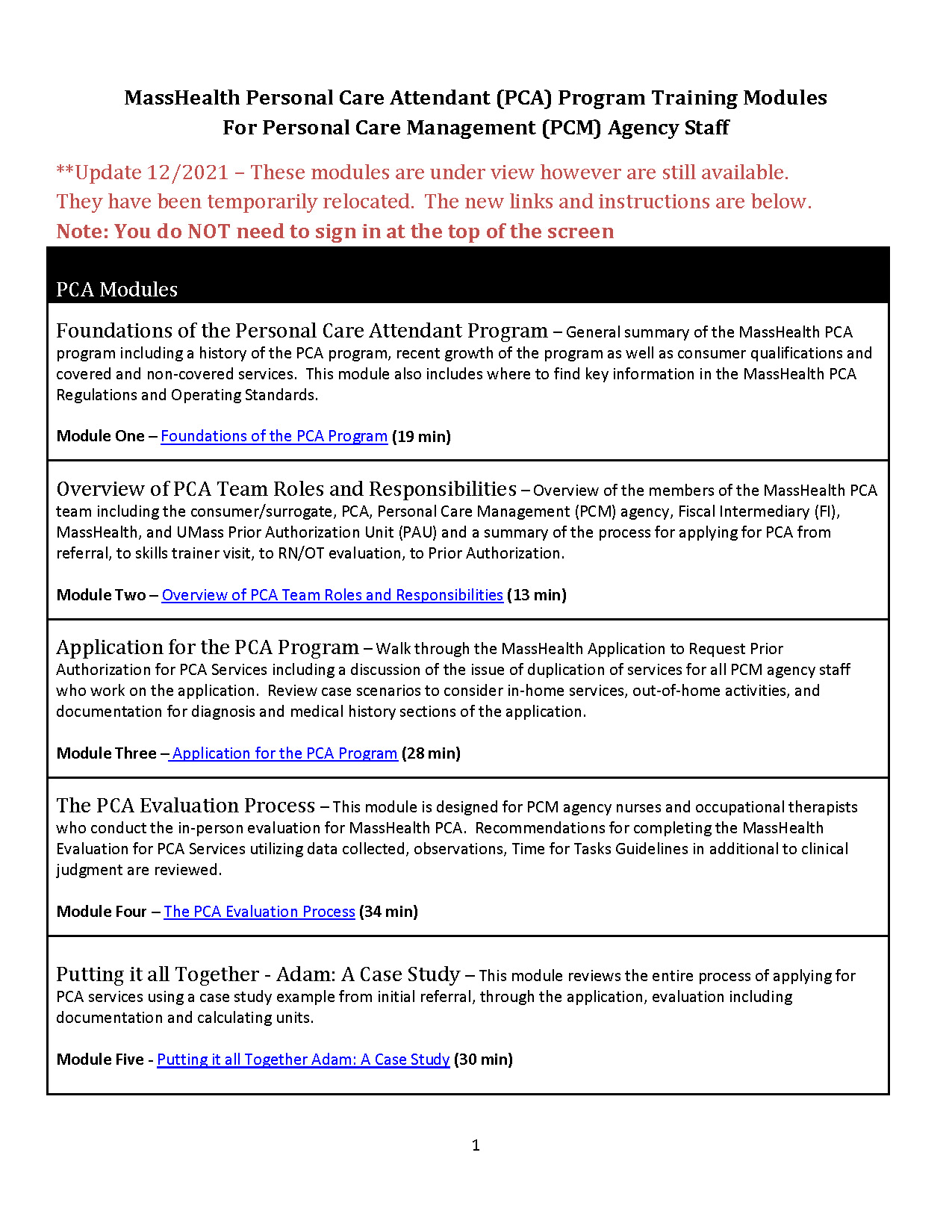 Listed Below are MassHealth Personal Care Attendant (PCA) Program Training Modules for Personal Care Management (PCA) Agency Staff