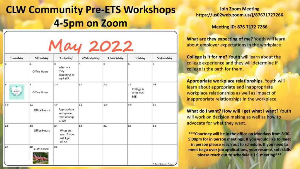 Pre-ETS May Calendar is here! Join Pre-ETS today to access all our workshops we are offering this month, future workshops, events and more.