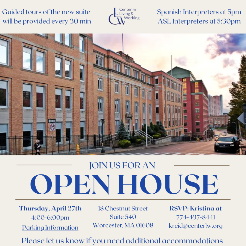 Exciting things are happening at Center for Living & Working. WE HAVE MOVED. Since our last newsletter we have moved to CLW’s new location is now at 18 Chestnut St., Suite 540, Worcester, Ma. Our telephone number and email remain the same. We are open to walk ins and consumers and look forward to serving you from our beautiful new office. We will have an open house on April 27th at 4 PM to show off our spacious and bright new space. Directions are below.