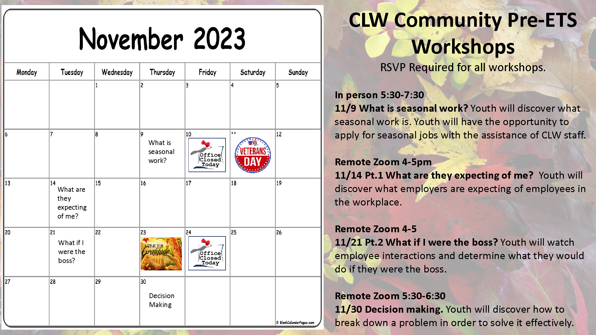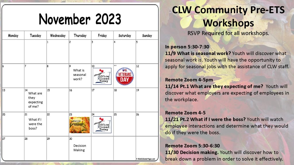 Pre-ETS November 2023 Calendar is here! Join Pre-ETS to access our Workshops, Events and More!
