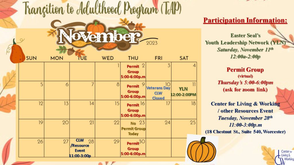 TAP March Calendar offers social and focused group workshops and networking events to build and sustain social opportunities. For parents, Center for Living & Working partners with Easter Seals of Worcester to host a parent group where professions discuss pertinent topics and offer assistance to parents navigating the services system.