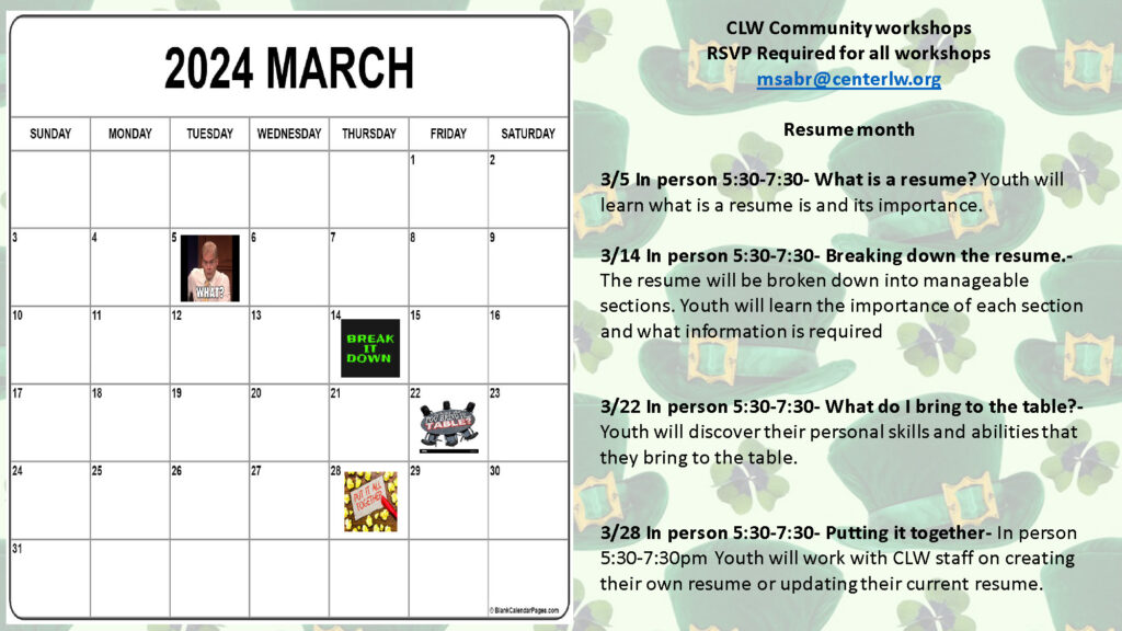 3/28 In person 5:30-7:30- Putting it together- In person 5:30-7:30pm Youth will work with CLW staff on creating their own resume or updating their current resume.