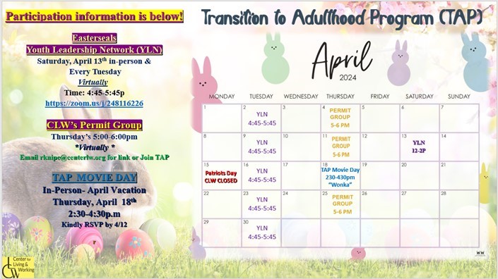 TAP April 2024 calendar offers social and focused group workshops and networking events to build and sustain social opportunities. For parents, Center for Living & Working partners with Easter Seals of Worcester to host a parent group where professions discuss pertinent topics and offer assistance to parents navigating the services system.