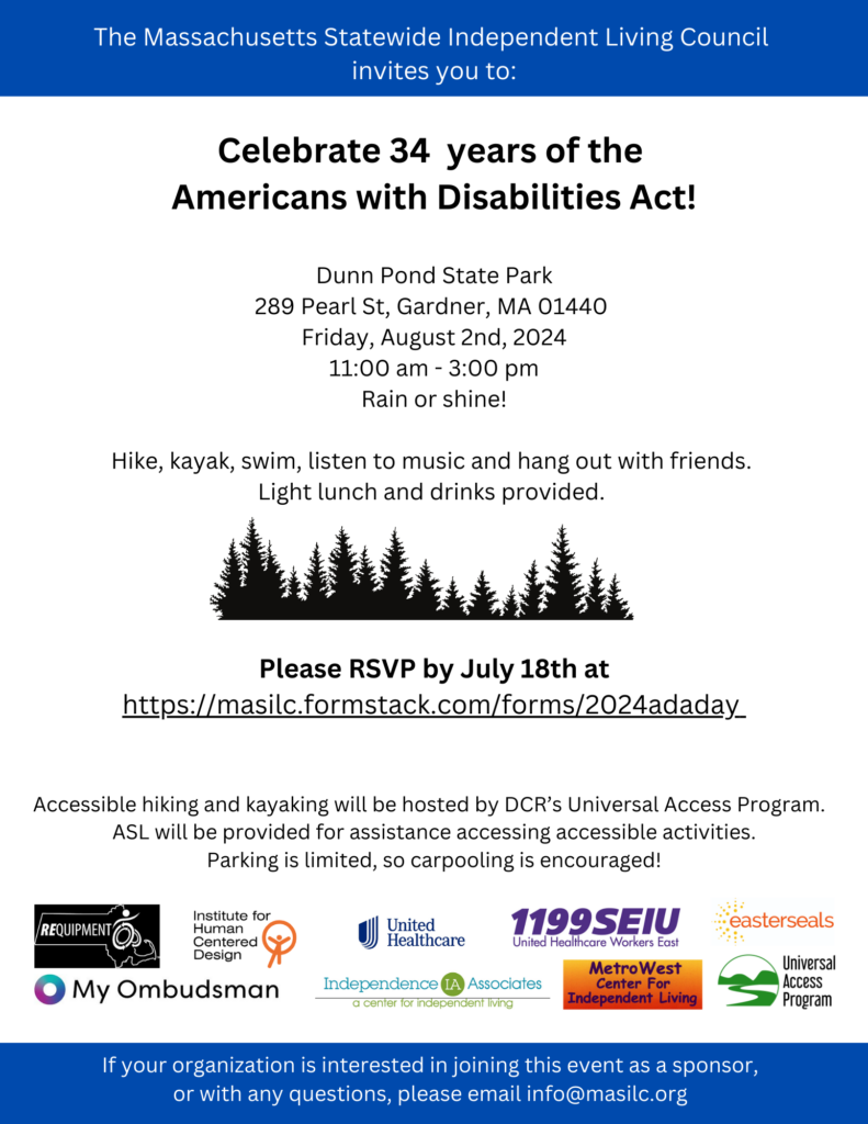 Celebrate 34 years of the Americans with Disabilities Act with an ADA Day at Dunn Pond State Park Accessible hiking and kayaking will be hosted by DCR’s Universal Access Program. Parking is limited, so carpooling encouraged! Rain or shine! Hike, kayak, swim, listen to music and hang out with friends. Light lunch and drinks provided.